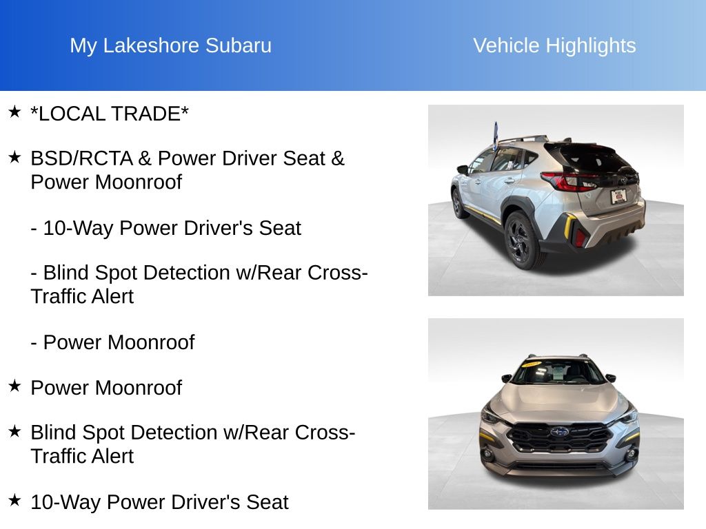 Crosstrek Sport, Ice Silver Metallic, *ALL WHEEL DRIVE*, *APPLE CARPLAY & ANDROID AUTO*, *BACKUP CAMERA*, *EYESIGHT Driver Assist*, *HEATED SEATS*, *LANE DEPARTURE WARNING*, *LOCAL TRADE*, *MOONROOF*, *OIL CHANGES for LIFE*, 10-Way Power Driver's Seat, Blind Spot Detection w/Rear Cross-Traffic Alert, BSD/RCTA & Power Driver Seat & Power Moonroof, Power Moonroof. Certified. Ice Silver Metallic 2024 Subaru Crosstrek Sport AWD Lineartronic CVT 2.5L 4-Cylinder DOHC 16V