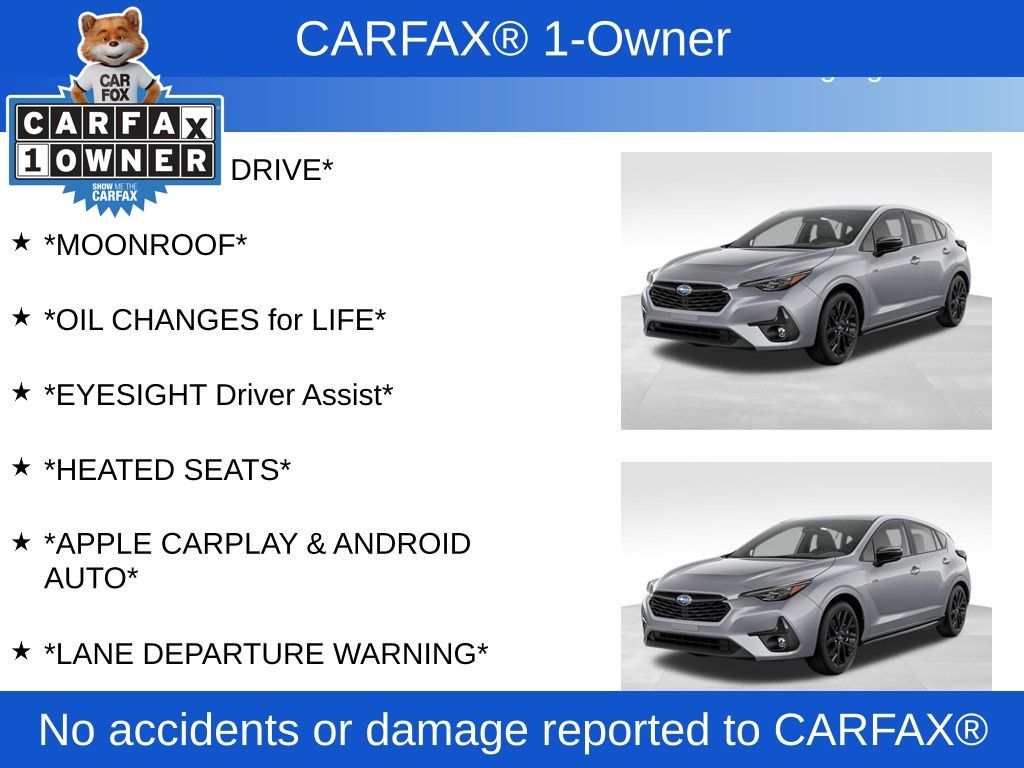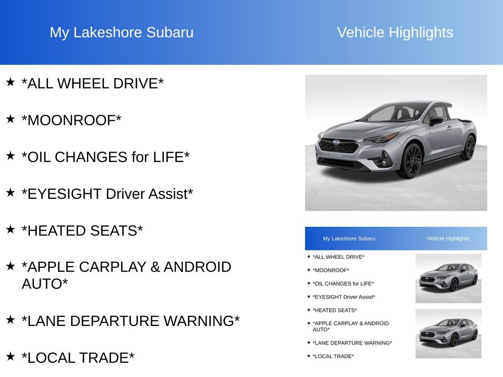 Impreza 2.5RS, Ice Silver Metallic, *ALL WHEEL DRIVE*, *APPLE CARPLAY & ANDROID AUTO*, *EYESIGHT Driver Assist*, *HEATED SEATS*, *LANE DEPARTURE WARNING*, *LOCAL TRADE*, *MOONROOF*, *OIL CHANGES for LIFE*. Certified. Ice Silver Metallic 2024 Subaru Impreza 2.5RS AWD CVT Lineartronic 2.5L DOHC