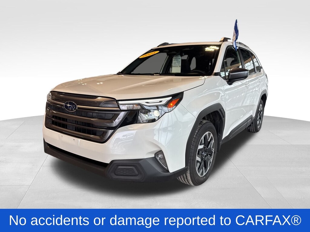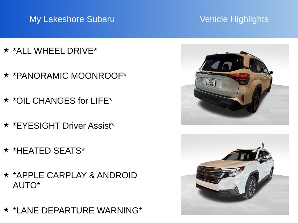 Forester Premium, Crystal White Pearl, *ALL WHEEL DRIVE*, *APPLE CARPLAY & ANDROID AUTO*, *EYESIGHT Driver Assist*, *HEATED SEATS*, *LANE DEPARTURE WARNING*, *OIL CHANGES for LIFE*, *PANORAMIC MOONROOF*. Certified. Crystal White Pearl 2025 Subaru Forester Premium AWD Lineartronic CVT 2.5L 4-Cylinder DOHC 16V