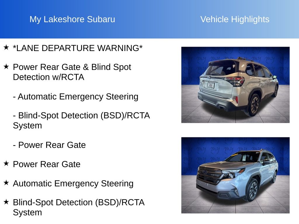 Forester Premium, Ice Silver Metallic, *ALL WHEEL DRIVE*, *APPLE CARPLAY & ANDROID AUTO*, *BACKUP CAMERA*, *BLIND SPOT ALERT*, *EYESIGHT Driver Assist*, *HEATED SEATS*, *LANE DEPARTURE WARNING*, *OIL CHANGES for LIFE*, *PANORAMIC MOONROOF*, Automatic Emergency Steering, Blind-Spot Detection (BSD)/RCTA System, Power Rear Gate, Power Rear Gate & Blind Spot Detection w/RCTA. Certified. Ice Silver Metallic 2025 Subaru Forester Premium AWD Lineartronic CVT 2.5L 4-Cylinder DOHC 16V
