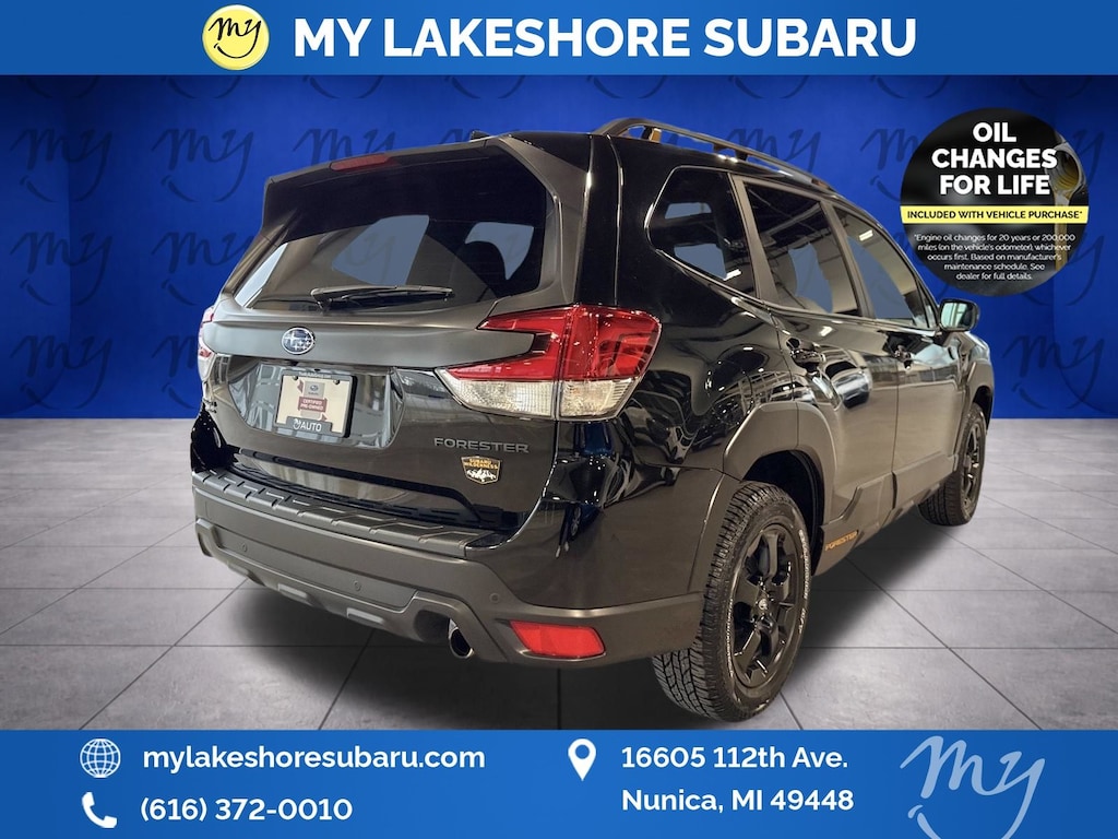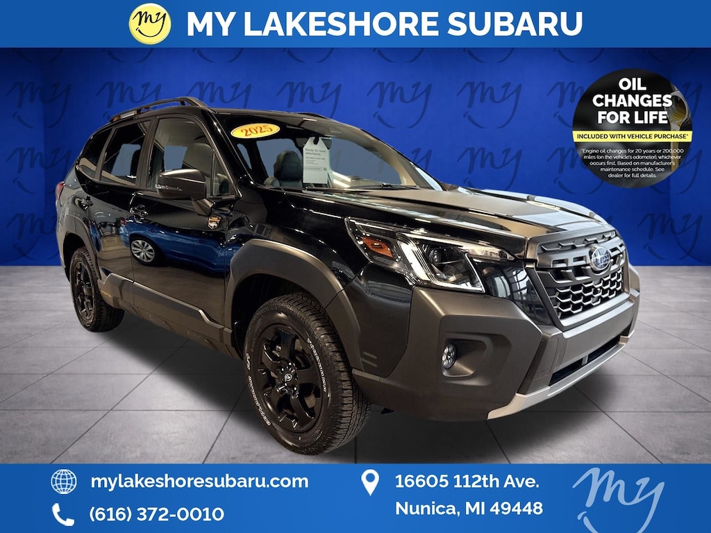 Forester Wilderness, Crystal Black Silica, *ALL WHEEL DRIVE*, *APPLE CARPLAY & ANDROID AUTO*, *BLIND SPOT ALERT*, *EYESIGHT Driver Assist*, *HEATED SEATS*, *LANE DEPARTURE WARNING*, *OIL CHANGES for LIFE*, *PANORAMIC MOONROOF*. Certified. Crystal Black Silica 2025 Subaru Forester Wilderness AWD Lineartronic CVT 2.5L 4-Cylinder DOHC 16V