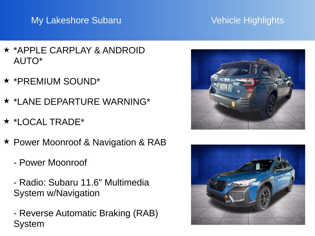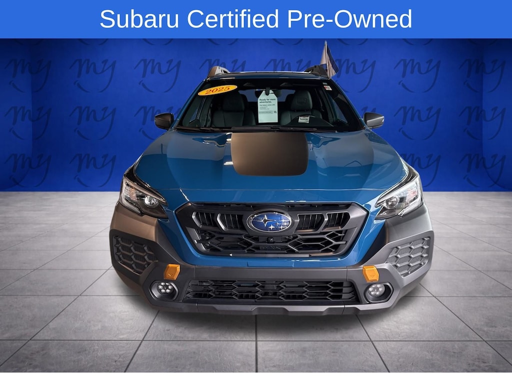 Outback Wilderness, Geyser Blue, *ALL WHEEL DRIVE*, *APPLE CARPLAY & ANDROID AUTO*, *BACKUP CAMERA*, *EYESIGHT Driver Assist*, *HEATED REAR Seats*, *HEATED STEERING WHEEL*, *LANE DEPARTURE WARNING*, *LEATHER HEATED POWER SEATS*, *LOCAL TRADE*, *MOONROOF*, *OIL CHANGES for LIFE*, *PREMIUM SOUND*, Power Moonroof, Power Moonroof & Navigation & RAB, Radio: Subaru 11.6" Multimedia System w/Navigation, Reverse Automatic Braking (RAB) System. Certified. Geyser Blue 2025 Subaru Outback Wilderness AWD CVT Lineartronic 2.4L DOHC