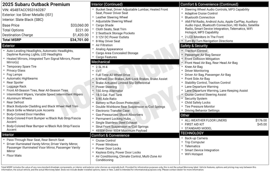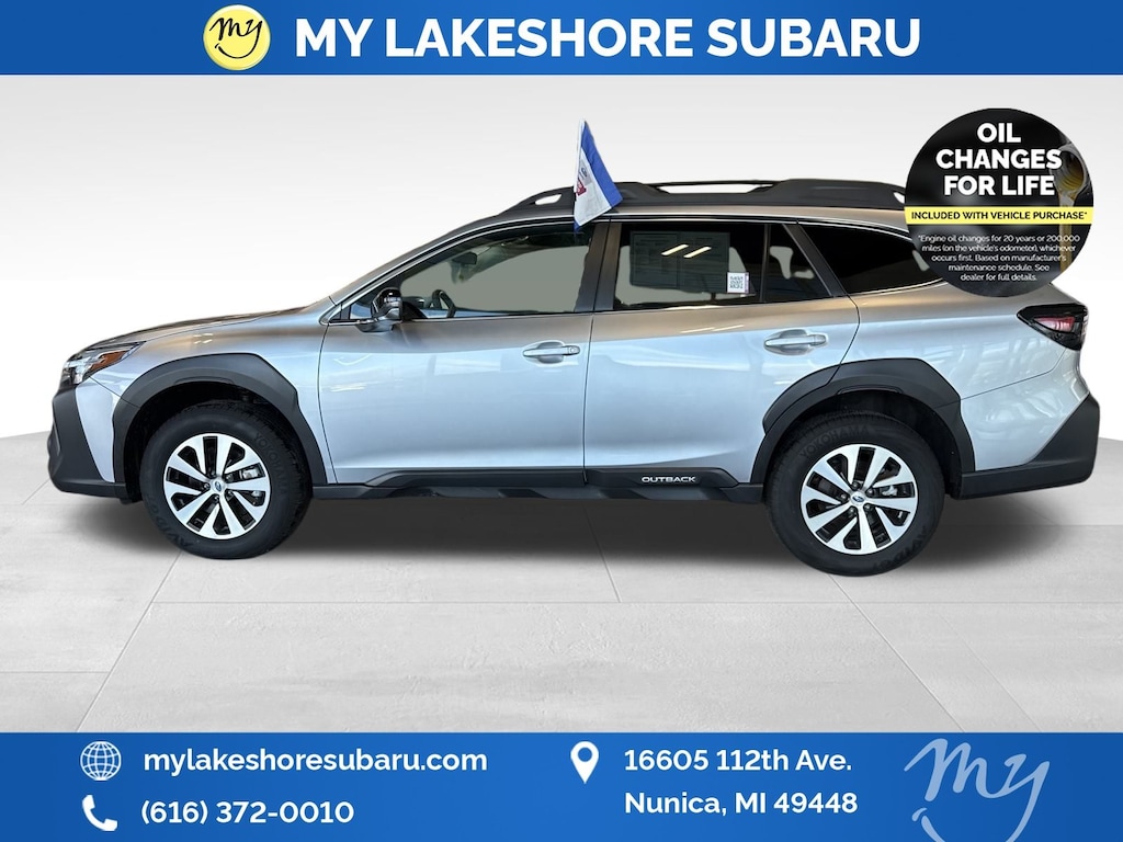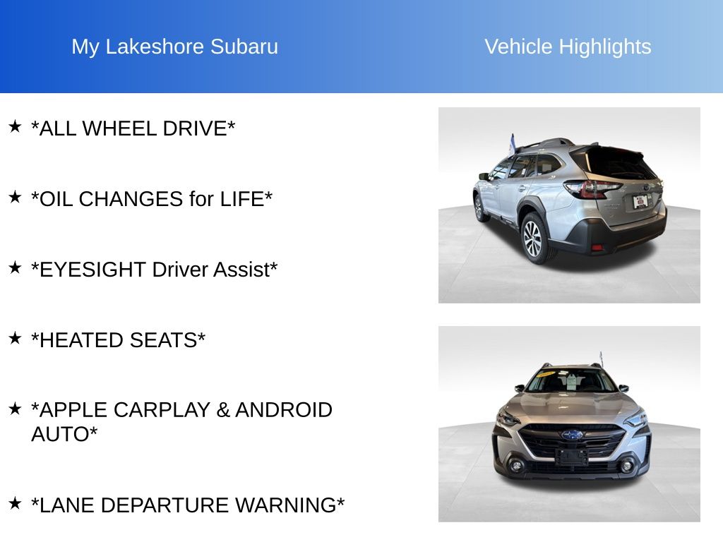 Outback Premium, Ice Silver Metallic, *ALL WHEEL DRIVE*, *APPLE CARPLAY & ANDROID AUTO*, *EYESIGHT Driver Assist*, *HEATED SEATS*, *LANE DEPARTURE WARNING*, *OIL CHANGES for LIFE*. Certified. Ice Silver Metallic 2025 Subaru Outback Premium AWD CVT Lineartronic 2.5L 4-Cylinder DOHC 16V