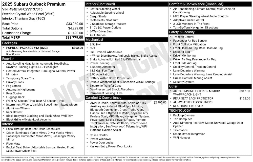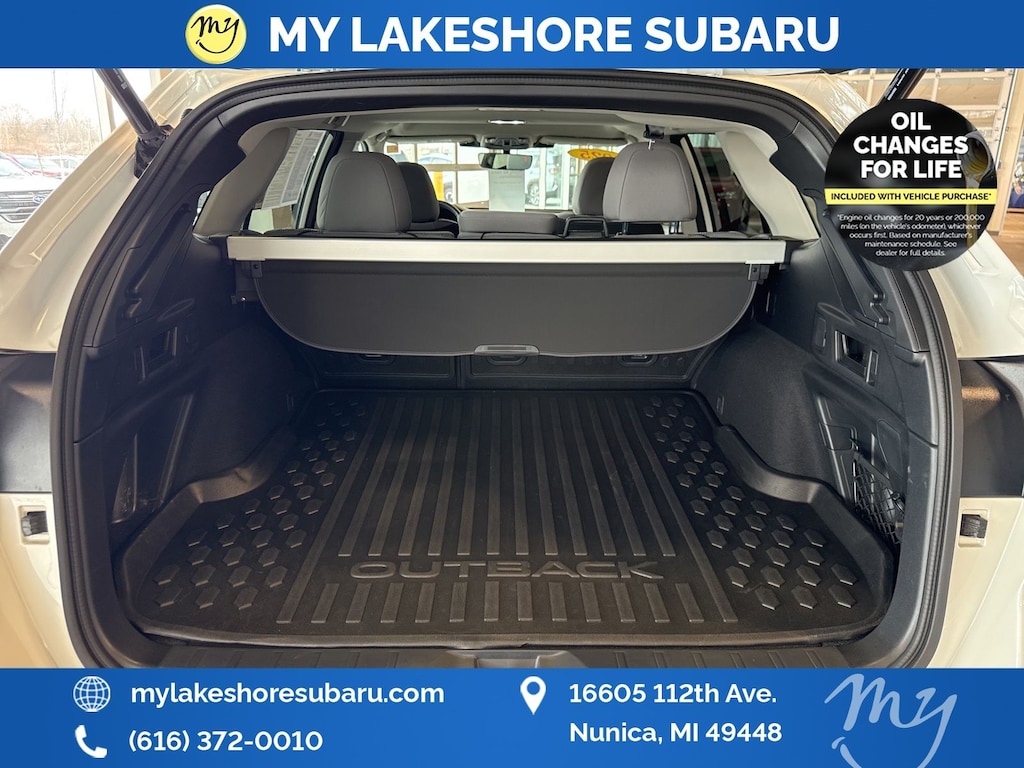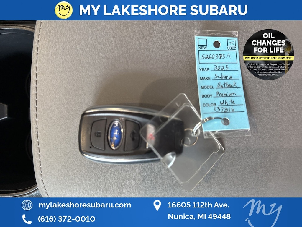 Outback Premium, Crystal White Pearl, *ALL WHEEL DRIVE*, *APPLE CARPLAY & ANDROID AUTO*, *BACKUP CAMERA*, *EYESIGHT Driver Assist*, *HEATED SEATS*, *LANE DEPARTURE WARNING*, *LOCAL TRADE*, *MOONROOF*, *OIL CHANGES for LIFE*, All-Weather Floor Liners, Auto-Dimming Mirror w/Compass & HomeLink, Blind Spot Detection (BSD), BSD & RCTA & Keyless Access & Push Button Start, Hands-Free Power Rear Gate, Keyless Access w/Push Button Start, Popular Package #1A, Power Moonroof, Radio: Subaru 11.6" Multimedia System w/Navigation, Rear Bumper Cover, Rear Cross Traffic Alert (RCTA). Certified. Crystal White Pearl 2025 Subaru Outback Premium AWD CVT Lineartronic 2.5L 4-Cylinder DOHC 16V