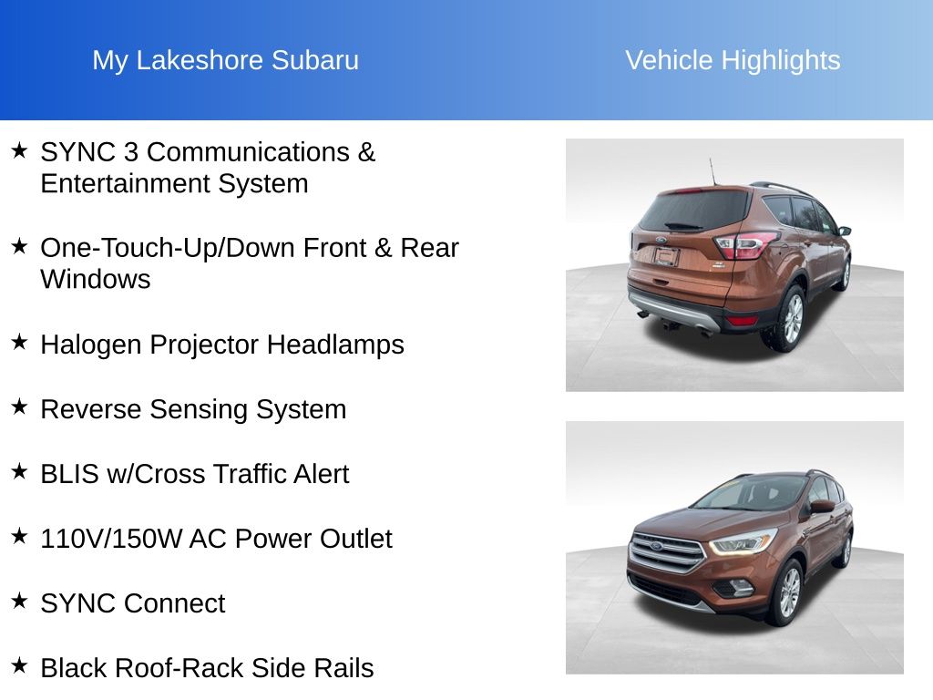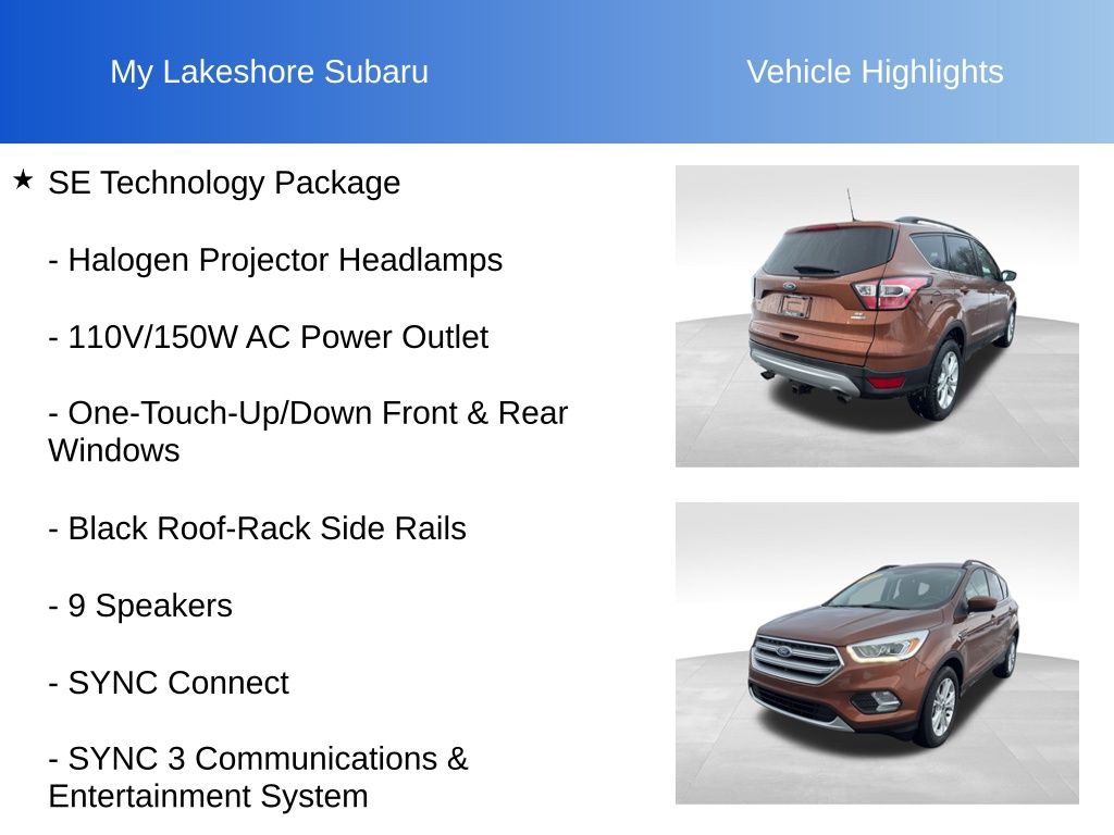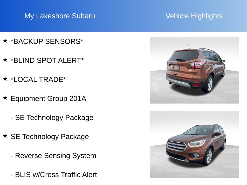 Escape SE, 4WD, Canyon Ridge Metallic, *BACKUP SENSORS*, *BLIND SPOT ALERT*, *LOCAL TRADE*, 110V/150W AC Power Outlet, 9 Speakers, Black Roof-Rack Side Rails, BLIS w/Cross Traffic Alert, Equipment Group 201A, Halogen Projector Headlamps, One-Touch-Up/Down Front & Rear Windows, Reverse Sensing System, SE Technology Package, SYNC 3 Communications & Entertainment System, SYNC Connect. Canyon Ridge Metallic 2017 Ford Escape SE 4WD 6-Speed Automatic EcoBoost 2.0L I4 GTDi DOHC Turbocharged VCT