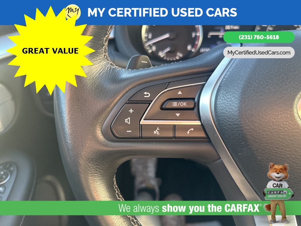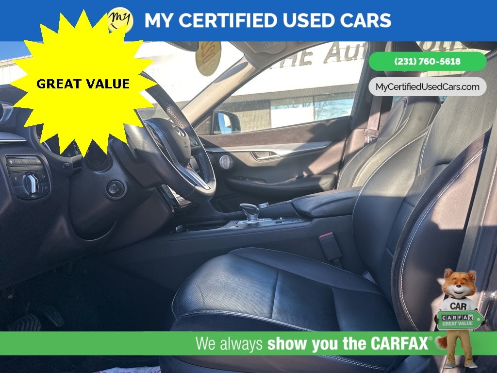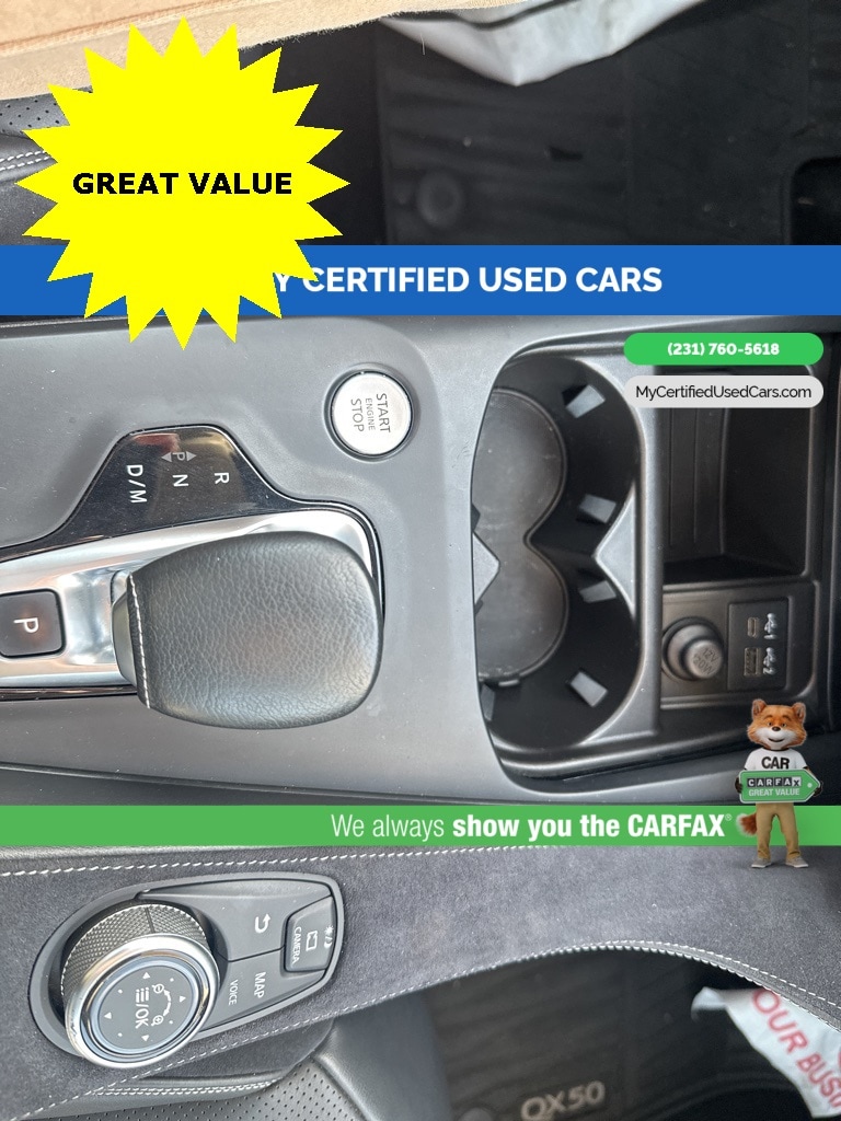 ***This 2022 INFINITI QX50 Sensory is LOADED with OPTIONS (*PANORAMIC MOONROOF*), 4D Sport Utility, AWD, *APPLE CARPLAY & ANDROID AUTO*, *BACKUP CAMERA*, *BACKUP SENSORS*, *HEATED SEATS*, *LEATHER HEATED POWER SEATS*, *NAVIGATION SYSTEM*, *PREMIUM SOUND*, *PREMIUM WHEELS*, *REMOTE START*, *VERY CLEAN*, Heated front seats, Memory seat, Navigation system: INFINITI InTouch Navigation, Power Liftgate, Power moonroof, Radio: Bose Performance Series Audio System, Ventilated front seats, Wheels: 20" Silver Painted Machine Finished. MY Certified Used Cars of Muskegon is your #1 choice in Michigan to get the BEST PRICE on used vehicles and BEST value for your trade. The MY Certified Used Cars team is ready to provide you with a world-class experience, ensuring that you find the perfect vehicle that fits all your needs. Every vehicle has been through a full safety inspection completed by certified technicians and fully detailed. We sell many makes and models, Pre-Owned Vehicles with years from 2025-2024-2023-2022-2021-2020-2019-2018-2017-2016-2015-2014-2013-2012-2011-2010-2009-2008-2007 and all makes Audi, BMW, Chevrolet, Toyota, Volkswagen, Kia, Hyundai, Mercedes, Dodge, Chrysler, Jeep, Ram, Lincoln, Honda, Subaru, and many models like Bronco, Bronco Sport, Edge, Escapes, Expedition, Explorer, Fusions, Focus, Flex, F-150 Series, F-250, F-350, Super Duty Diesel Trucks, Maverick, Mustang MACH-E, Mustang, Ranger, Transit, Wrangler, Grand Cherokee, Grand Cherokee L, Wagoneer, Gladiator, Grand Caravan, RAM, RAM HEMI, and more. Take advantage of our VIP experience by calling 231-760-5618 to schedule a test drive. Read our customer reviews at www.mycertifiedusedcars.com/testimonials or view our entire selection of preowned vehicles at www.mycertifiedusedcars.com, or stop by today, located at 3692 Airline Rd. Muskegon, MI 49444. CARFAX One-Owner. Mineral Black 2022 INFINITI QX50 Sensory AWD CVT I4