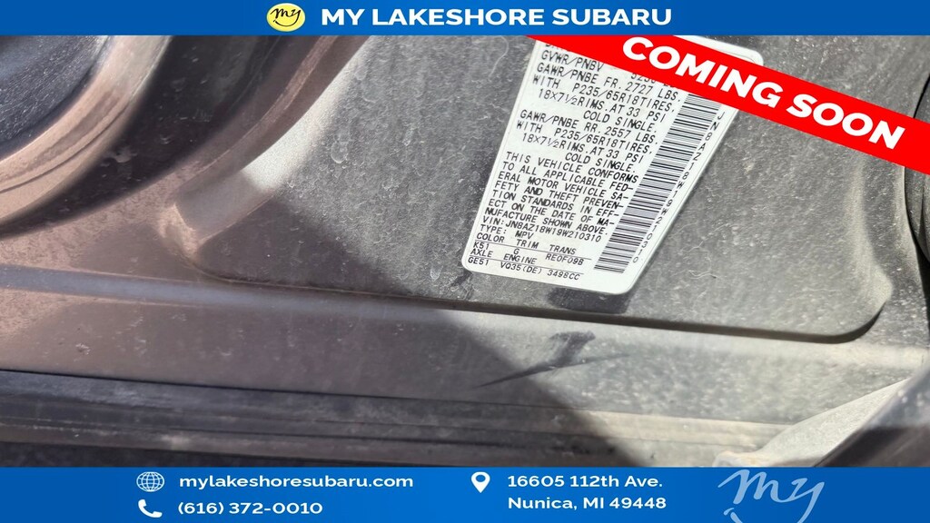 My Lakeshore Subaru is your #1 choice in Michigan to get the BEST PRICE on used vehicles and BEST value for your trade. The My Lakeshore Subaru team is ready to provide you with a world-class experience, ensuring that you find the perfect vehicle that fits all your needs. Every vehicle has been through a full safety inspection completed by certified technicians and fully detailed. We sell many makes and models, Certified Pre-owned Subaruâs and Pre-owned Vehicles with years from 2025-2024-2023-2022-2021-2020-2019-2018-2017-2016-2015-2014-2013-2012-2011-2010-2009-2008-2007 and all makes Audi, BMW, Chevrolet, Toyota, Volkswagen, Kia, Hyundai, Mazda, Mercedes, Dodge, Chrysler, Jeep, Ram, Lincoln, Honda, Subaru, and many models like Crosstrek, Outback, Forester, Accent, Legacy, WRX, BRZ, Solterra, and more. Take advantage of our VIP experience by calling 231-867-6957 to schedule a test drive. Read our customer reviews and view our entire selection of preowned vehicles at www.mylakeshoresubaru.com, or stop by today, located at 16605 112th Ave, Nunica, MI 49448. Recent Arrival!