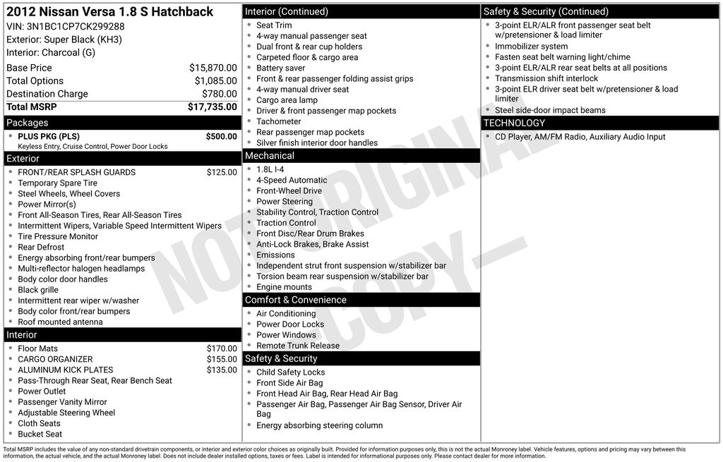 Super Black Metallic 2012 Nissan Versa 1.8 S 1.8L 4-Cylinder DOHC 16V FWD Odometer is 15591 miles below market average!