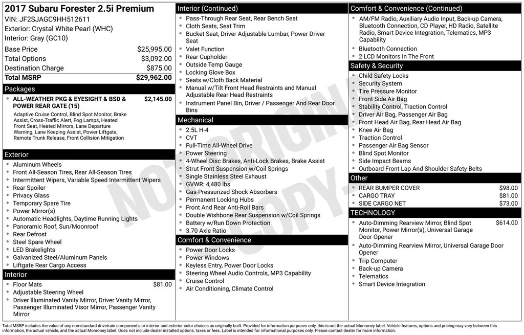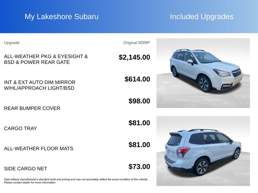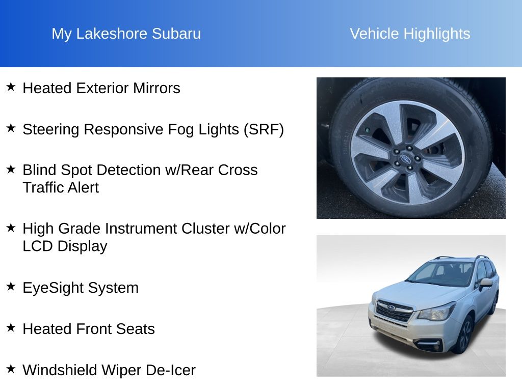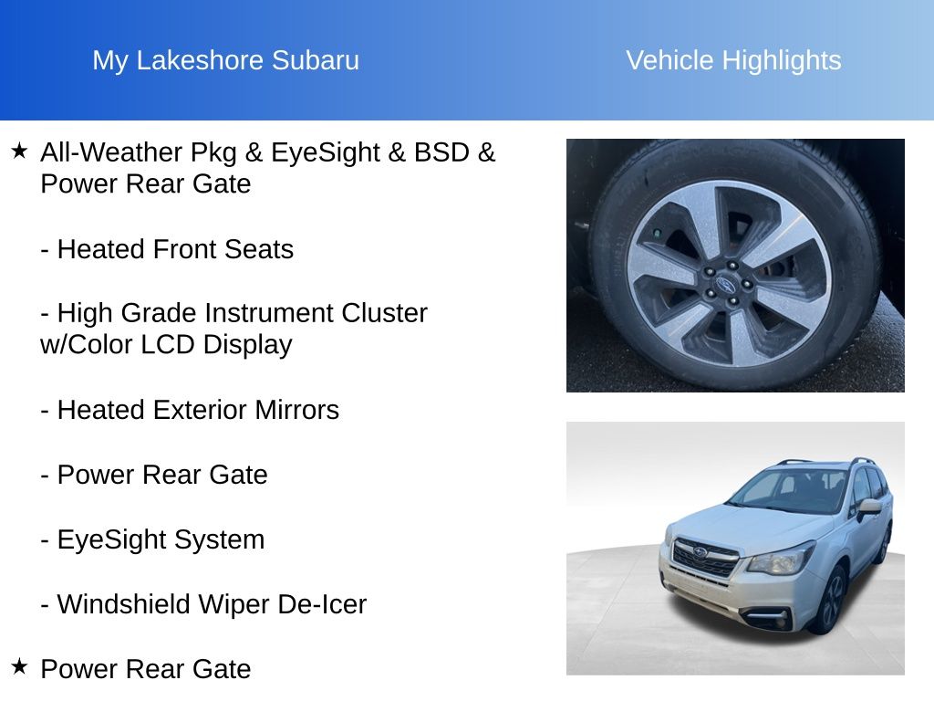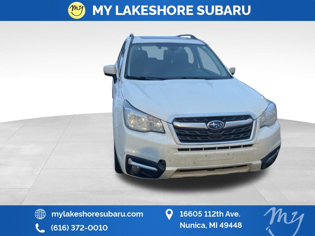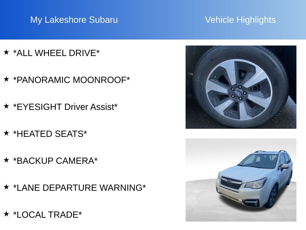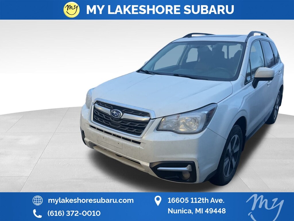 Forester 2.5i Premium, Crystal White Pearl, *ALL WHEEL DRIVE*, *BACKUP CAMERA*, *EYESIGHT Driver Assist*, *HEATED SEATS*, *LANE DEPARTURE WARNING*, *LOCAL TRADE*, *PANORAMIC MOONROOF*, All-Weather Pkg & EyeSight & BSD & Power Rear Gate, Blind Spot Detection w/Rear Cross Traffic Alert, EyeSight System, Heated Exterior Mirrors, Heated Front Seats, High Grade Instrument Cluster w/Color LCD Display, Power Rear Gate, Steering Responsive Fog Lights (SRF), Windshield Wiper De-Icer. Crystal White Pearl 2017 Subaru Forester 2.5i Premium AWD Lineartronic CVT 2.5L 4-Cylinder DOHC 16V VVT