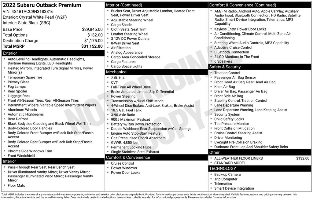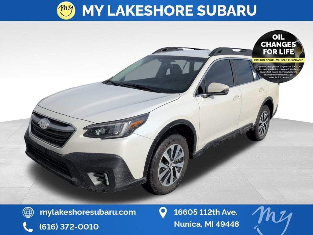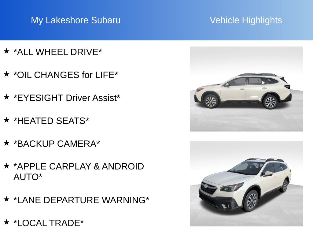 Outback Premium, Crystal White Pearl, *ALL WHEEL DRIVE*, *APPLE CARPLAY & ANDROID AUTO*, *BACKUP CAMERA*, *EYESIGHT Driver Assist*, *HEATED SEATS*, *LANE DEPARTURE WARNING*, *LOCAL TRADE*, *OIL CHANGES for LIFE*. Crystal White Pearl 2022 Subaru Outback Premium AWD CVT Lineartronic 2.5L 4-Cylinder DOHC 16V