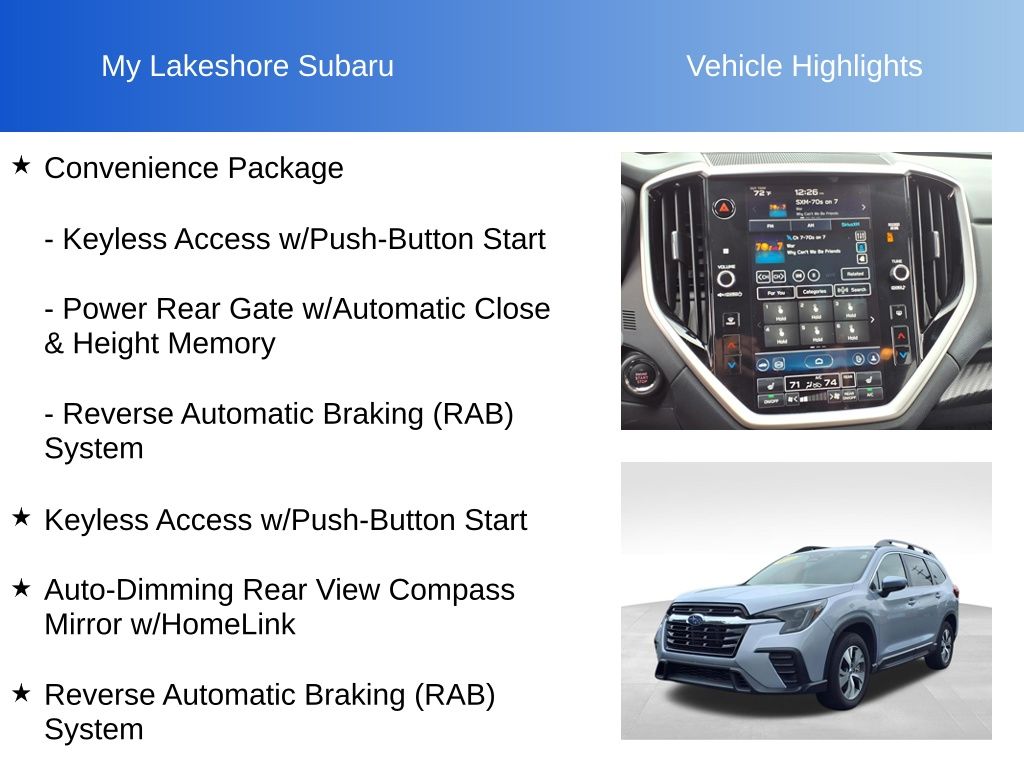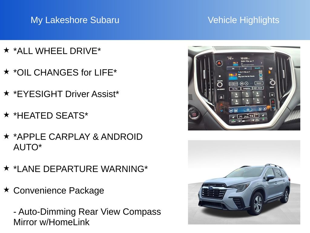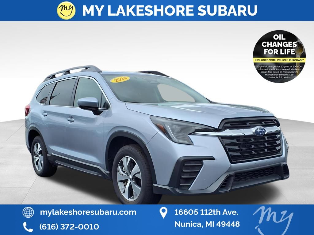 Ascent Premium, Ice Silver Metallic, *ALL WHEEL DRIVE*, *APPLE CARPLAY & ANDROID AUTO*, *EYESIGHT Driver Assist*, *HEATED SEATS*, *LANE DEPARTURE WARNING*, *OIL CHANGES for LIFE*, Auto-Dimming Rear View Compass Mirror w/HomeLink, Convenience Package, Keyless Access w/Push-Button Start, Power Rear Gate w/Automatic Close & Height Memory, Reverse Automatic Braking (RAB) System. Certified. Ice Silver Metallic 2024 Subaru Ascent Premium AWD Lineartronic CVT 2.4L 4-Cylinder DOHC 16V